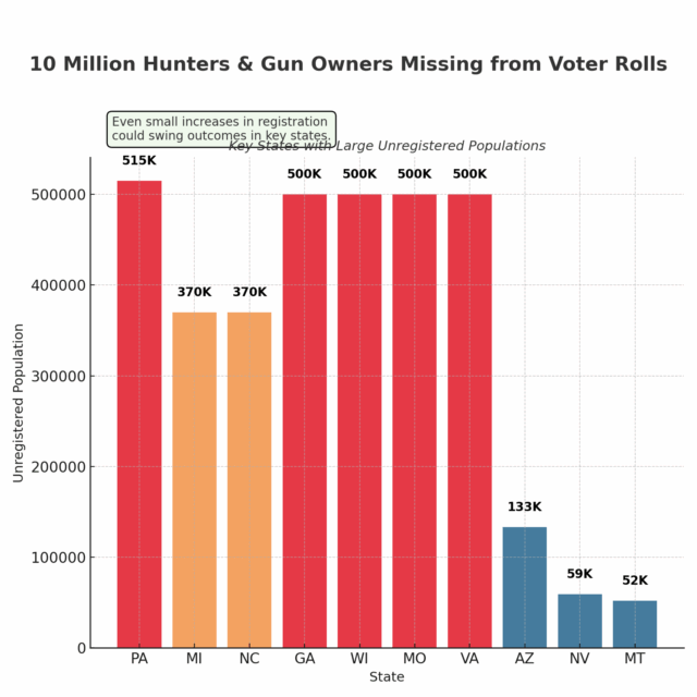 For hunters, gun owners, recreational shooters, and conservationists who care about preserving rights, traditions, and access to lands, the registration gap isn’t just a political statistic—it’s an urgent issue. The opportunity is real: even converting a few percentage points more of this population to registered and voting status can shift outcomes in key states and counties.